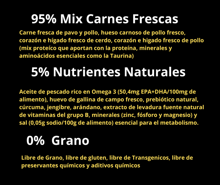 NUEVA FORMULA. Alimento crudo congelado de fórmula equilibrada para gatos. 95% carne fresca que aporta la proteína y taurina necesaria para la salud de tu gato. 5% Nutrientes Naturales y 0% Grano, gluten, transgénicos y libre de preservantes químicos